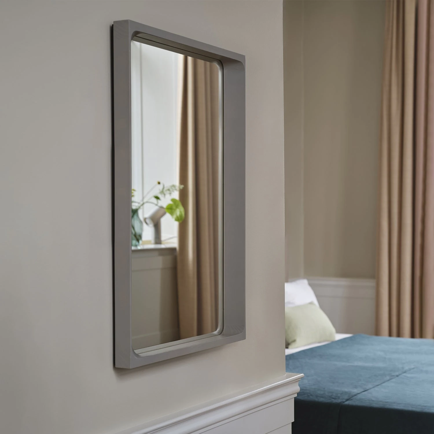 Frame made from FSC™-certified (FSC-C028824) spruce wood. Clear mirror glass. The spruce wood frame is treated with a wood stain colour and finished with a clear matte lacquer. The backside is enclosed by a black backboard.