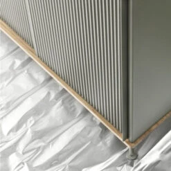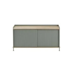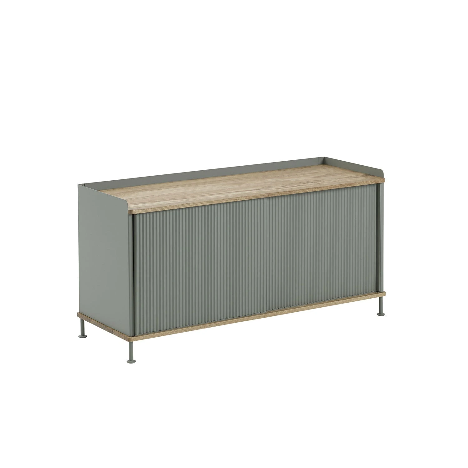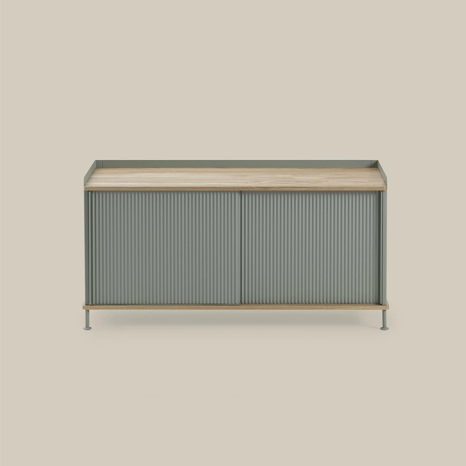 The Enfold Sideboard combines industrial materiality with residential references for a new perspective on modern storage. Made from a lacquered steel that gently enfolds its top and bottom in solid oak, the Enfold Sideboard fuses cold and warm materials for a unique expression, paired with the vibrantly modern expression of its ridged steel doors. The flexible design is available in four sizes, which all have adjustable shelves and discreet cable outlets. This offers the opportunity to find just the right fit for your space, function and needs – be it a media console, in the hallway or a tall sideboard for storage.