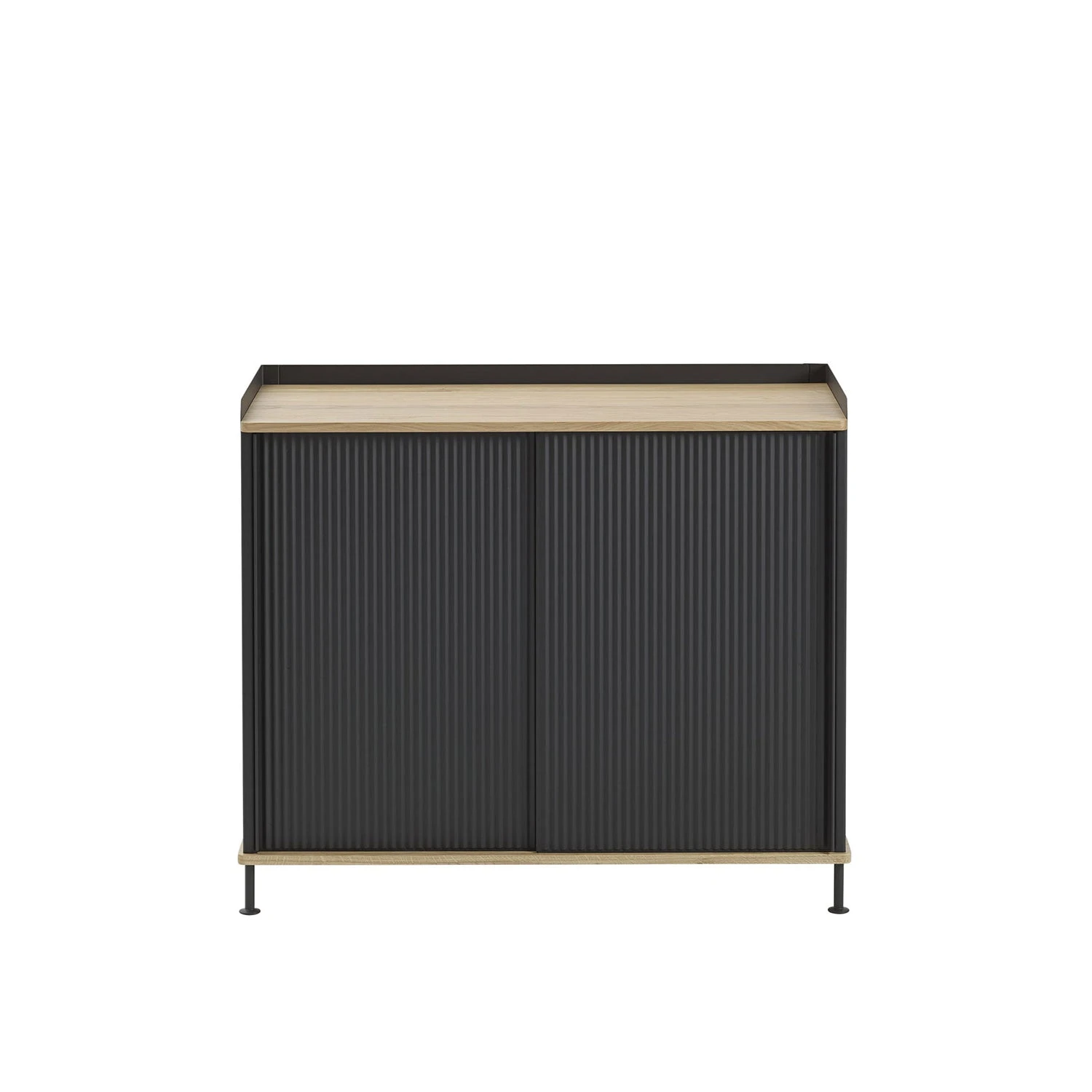 The Enfold Sideboard combines industrial materiality with residential references for a new perspective on modern storage. Made from a lacquered steel that gently enfolds its top and bottom in solid oak, the Enfold Sideboard fuses cold and warm materials for a unique expression, paired with the vibrantly modern expression of its ridged steel doors.