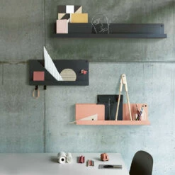 Imitating the look of folded paper yet shaped in metal, the Folded Shelves have a contemporary, functional character. The shelves come with two hooks and two bolts for mounting on the wall. The Folded Shelves are a modern and friendly way to add storage to any home or professional space.
