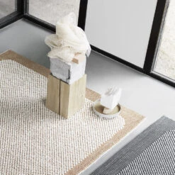 Pebble Rug has a diverse and tactile surface, inspired by the sensuous feeling of walking across a pebbled beach. Its handwoven structure contrasts the feel of its soft, wool loops with a canvas base in a sturdier wool quality. Pebble Rug has a distinct and modern woven texture for any home, hospitality setting, lobby, hotel space or co-working area.