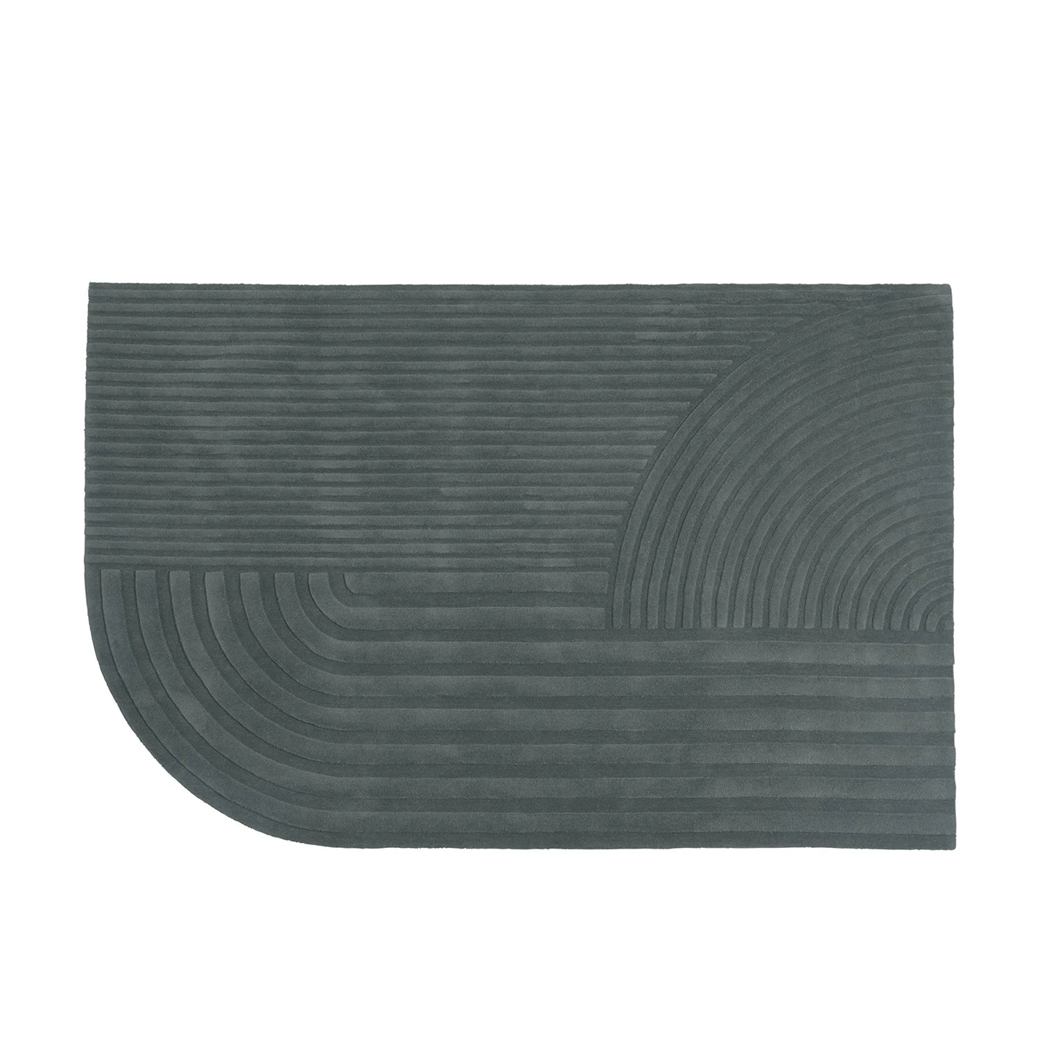 Relevo is a soft rug with a distinctly sculptural quality. Its striking graphic pattern is produced by trimming the tufted wool in different levels, thereby creating an eye-catching shadow-play that gives a sense of being two-tone rather than monochrome. The rug’s single rounded corner gives it a unique character, a dynamic expression in any setting.