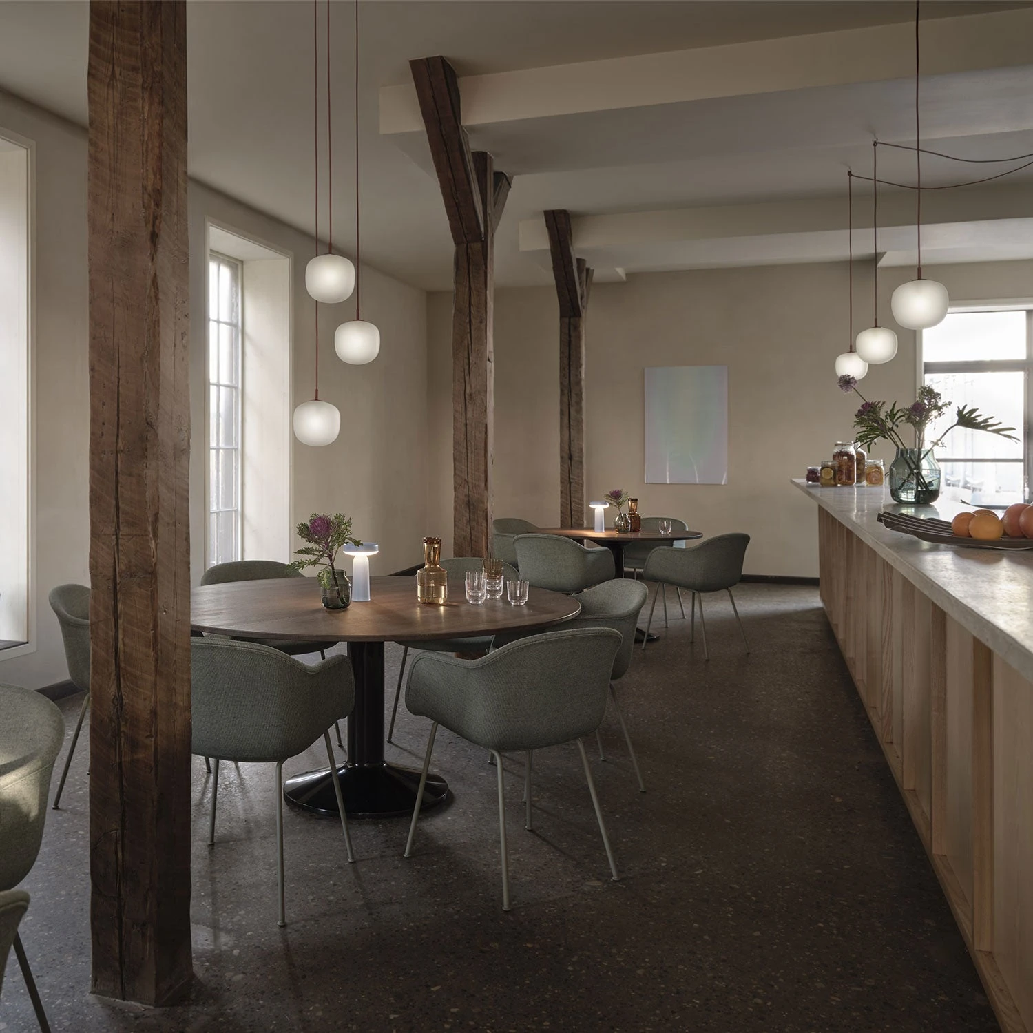 The Rime Pendant Lamp brings an elegant perspective to the glass pendant lamp through its semi-transparent glass that has been sandblasted for a refined expression. The design features a characteristic form, inspired by the shape of acorns, complemented by its powder-coated top-part, pendant tube and cord in a matching colour for a subtle touch. The design is available in various colours and sizes, allowing you to use the design on its own or in linear formations or playful clusters for a modern chandelier.